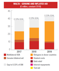 Malta is reporting 0.29% of ODA/GNI for 2019, up from 0.25% in 2018. In real terms, this is a year-on-year increase of €7.47 million (from €28.2 million in 2018 to €35 million in 2019). It can be traced to a rise of €10.05 million in bilateral assistance, which, however, was counterbalanced by a reduction in multilateral assistance of €3.26 million. While this is the third consecutive year with a notable increase (up 23.76% in 2017, 21.92% in 2018 and 32% in 2019) the Maltese AidWatch Working Group is concerned that these figures are due to the increase in reporting of in-donor refugee costs. Once again, this highlights a relative disproportionate reliance of the government on the inflated aid ratio.