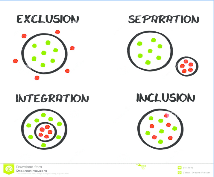 (Explain also that separation is called segregation sometimes and  that Inclusion is sometimes referred to as Integration in the media, the context in which it is used should give an indication if they mean ‘Integration’ or ‘Inclusion’ as we will see in the next section, these two concepts are different)